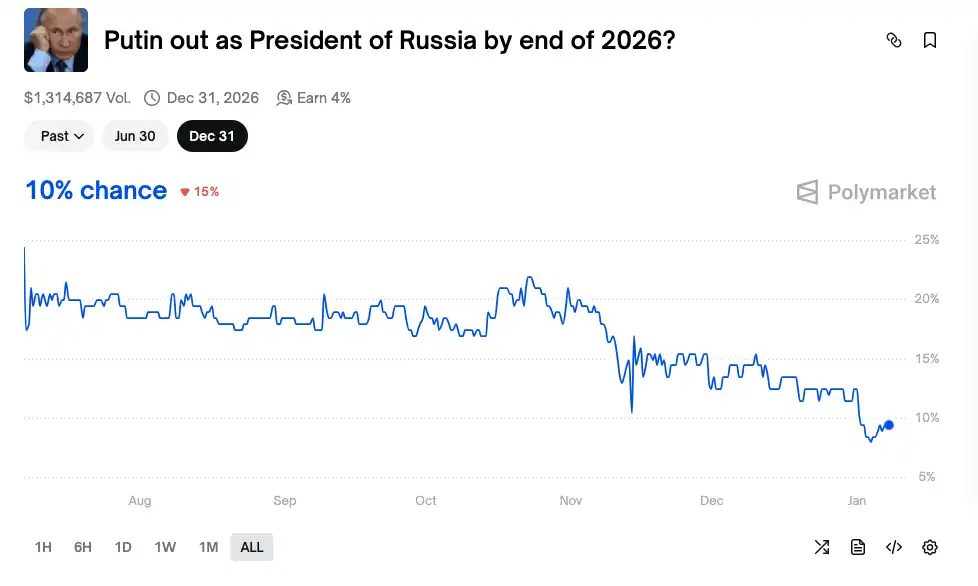 這些投入確實有效果,推動了許多「反常識」市場的交易。例如,「普京是否會在 2026 年底卸任」這一事件合約已有超 130 萬美元的交易量,持有這一合約份額將獲得 4% 的年化收益,對於有 Yes 份額的玩家而言,相當於最終有了 14% 的年化收益(10% 尾盤收益+4% 平台獎勵),吸引力巨大。對於持有 No 份額的玩家而言,掛單獎勵和持倉獎勵也對沖了一部分風險。