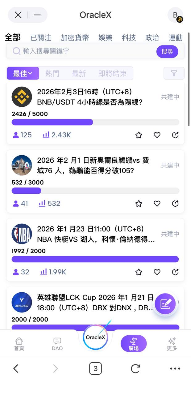 這種設計使OracleX從賽道層面完成了一次關鍵躍遷:它不再是一個圍繞事件展開的市場,而是一個圍繞群體判斷構建的共識網路。