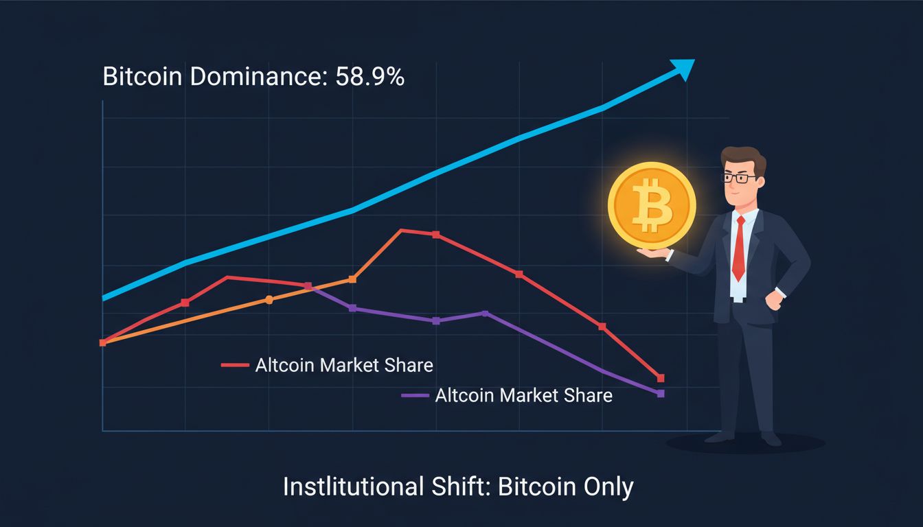 他補充指出,機構買盤通常將比特幣視為長期資產,並不傾向短期內將資金轉移至其他加密資產。這也造成本輪牛市中,比特幣的市場占有率持續上升。截至目前,根據 CoinMarketCap 數據顯示,比特幣的市佔率已高達 58.9%,意味著資金並未如以往般流入山寨幣。